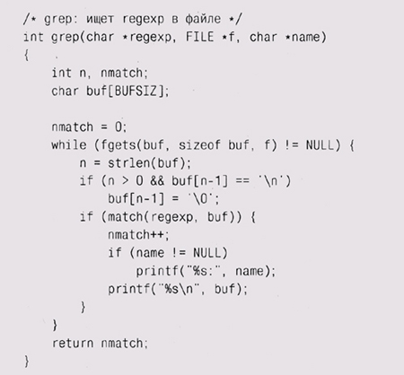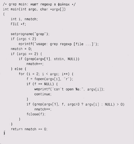 Наша реализация получилась довольно простенькой, однако она работает и занимает всего лишь три десятка строк кода — можно утверждать, что для того, чтобы ввести в обращение регулярные выражения, не нужно применять никаких сложных средств. Скоро мы представим некоторые соображения по расширению возможностей нашего кода, а пока напишем свою версию g rep, использующую match. Вот как выглядит основная часть:
