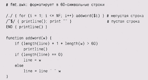 выводит "слова" по одному в строке. И напротив, вот программа f mt, которая заполняет каждую выводимую строку словами (до 60 символов); пустая строка означает конец параграфа:
