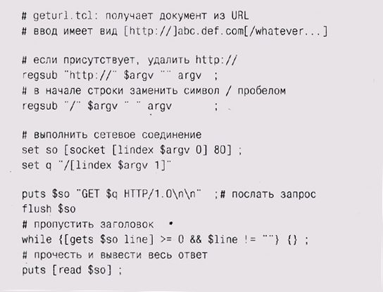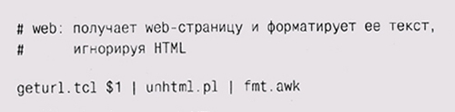 Отметьте, что мы неспроста использовали сразу несколько Жыков (Tel, Perl, Awk) и в каждом из них — регулярные выражения. Собственно говоря, мощь различных нотаций и состоит как раз в подборе наилучшего варианта для каждой проблемы. Teм особенно хорош для получения текста из сети, Perl и Awk прекрасно редактируют и форматируют текст, а регулярные выражения — отличный способ определения фрагментов текста, которые должны быть найдены и изменены. Объединение всех этих языков получается гораздо более мощным, чем любой из них в отдельности. Целесообразно разбить задачу на части, если можнс выиграть за счет составления правильной нотации в каждой из них. |