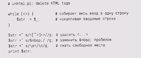 $str =" s/regexp/repl/g строке str подставляет строку repl вместо текста, соответствующего регулярному выражению readexp (берется крайне левое максимальное соответствие); завершающий символу (от "global") означает, что действия надо произвести глобально, для всех найденных соответствий, и не только для первого. Последовательность метасимволов \s является сокращенным обозначением символа пустого места (пробел, знак табуляции, символ перевода строки и т. п.); Это означает перевод строки. Строка " " — это символ HTML, как и те, о которых мы упоминали I главе 2, он означает non-breakable space — неразрывный пробел. Собрав все написанное воедино, мы получим совершенно идиотский, но функционирующий web-браузер, реализованный как скрипт командного интерпретатора, состоящий из одной строки: