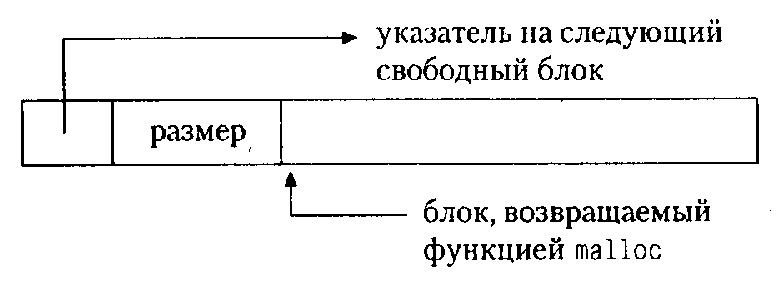 Свободный блок содержит указатель на следующий блок в списке, свой размер и собственно свободное пространство. Указатель и размер представляют собой управляющую информацию и образуют так называемый "заголовок". Чтобы упростить выравнивание, все блоки создаются кратными размеру заголовка, а заголовок соответствующим образом выравнивается. Этого можно достичь, сконструировав объединение, которое будет содержать соответствующую заголовку структуру и самый требовательный в отношении выравнивания тип. Для конкретности мы выбрали тип long.